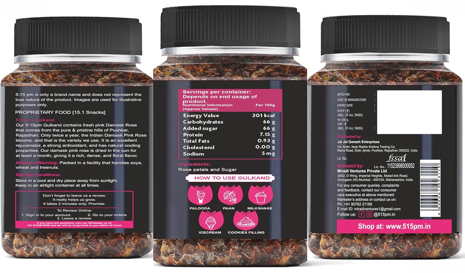 ✅𝐕𝐄𝐑𝐒𝐀𝐓𝐈𝐋𝐄 𝐔𝐒𝐄𝐒: Incorporate 5:15PM Gulkand into a variety of culinary delights such as thandai, fruit custard, milkshakes, lassi, rabdi, cakes, ladoos, and more. It enhances desserts like ice cream, and serves as a flavorful filling for cookies and paan, adding a touch of floral sweetness to every bite.