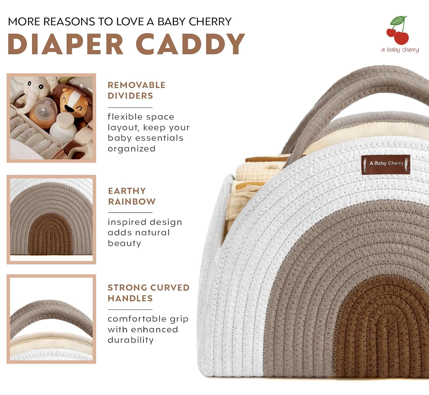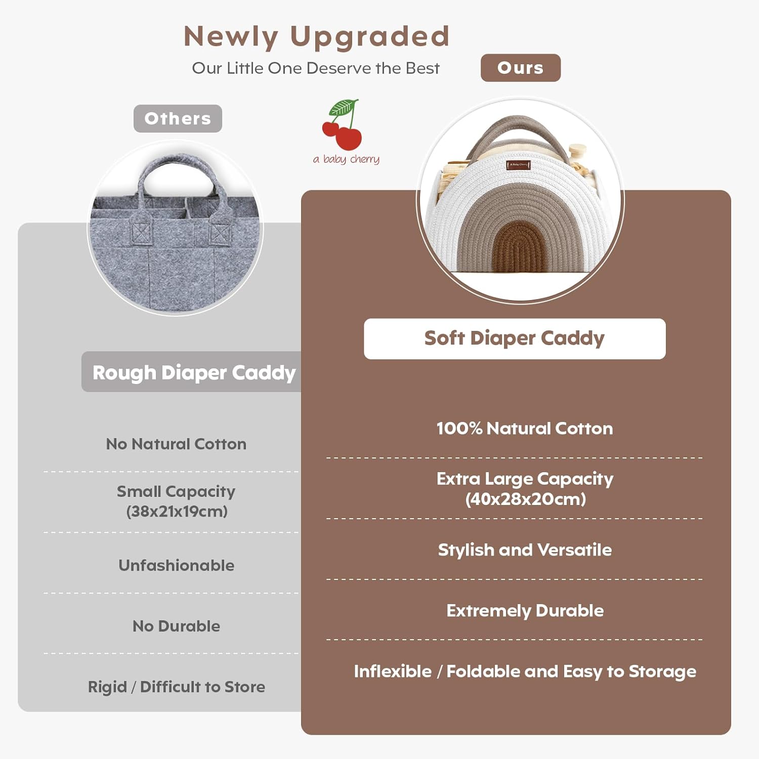 ✔️😀 ESSENTIAL STORAGE BASKET FOR NEWBORN PRODUCTS – A Baby Cherry Diaper Caddy/ diapers bag/caddy bag for baby is versatile enough for all that baby stuff: baby toys, diapers, baby clothes, baby wipes, bibs, onesies, baby toys, cloth diapers, changing pads, medicine, burp cloths, and other baby essentials! baby diaper bag/diaper bag for new born baby has Large enough fordiapers and most wipes dispensers.