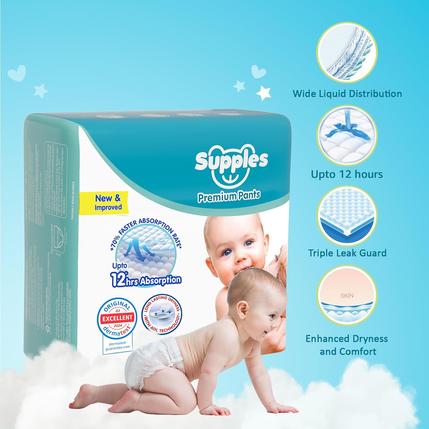 Gentle on Skin: Crafted from cushiony cotton soft fabric and non-woven, breathable materials, Supples Diapers are free from phthalates, ensuring gentle care for delicate skin.