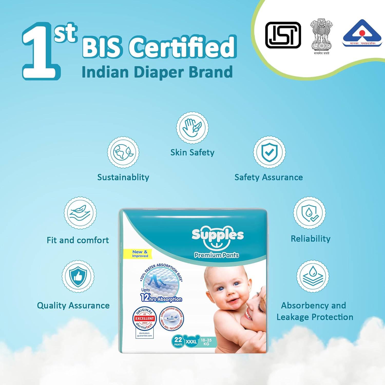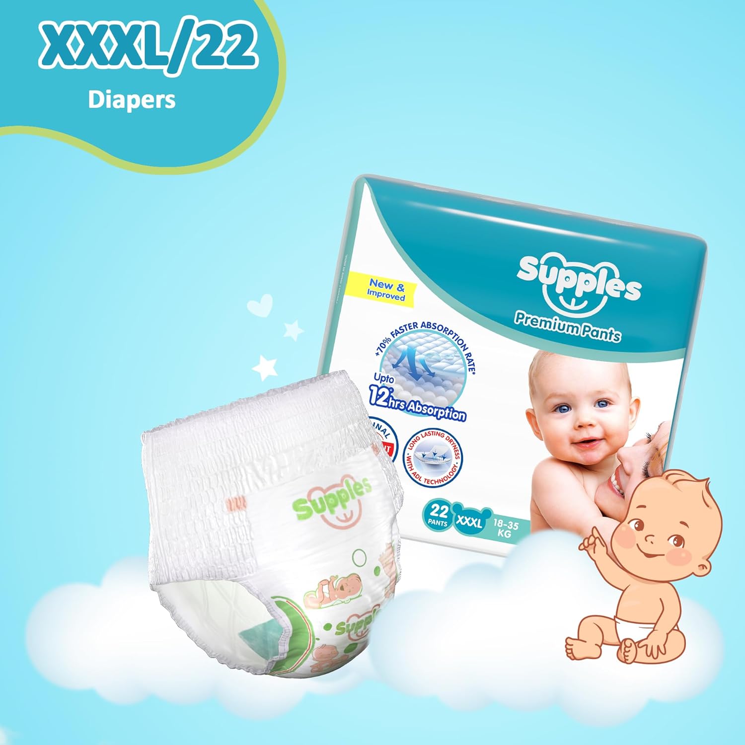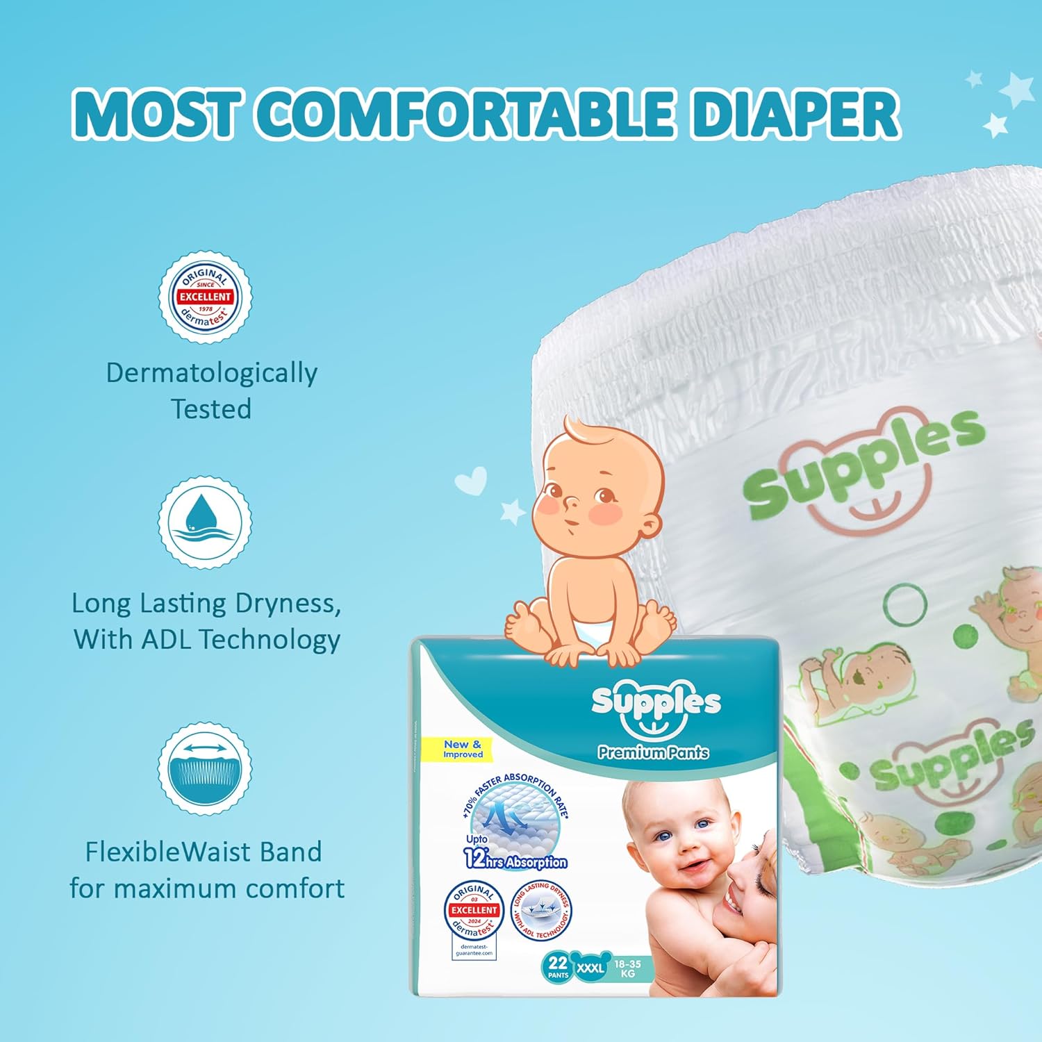 Amazon Brand – Supples Premium Baby Diaper Pants | 22 Baby Diapers | XXXL | 18-35 Kg | 12 Hrs Absorption | Cushiony Cotton Soft Fabric | Phthalates-Free | Triple Leak Guard