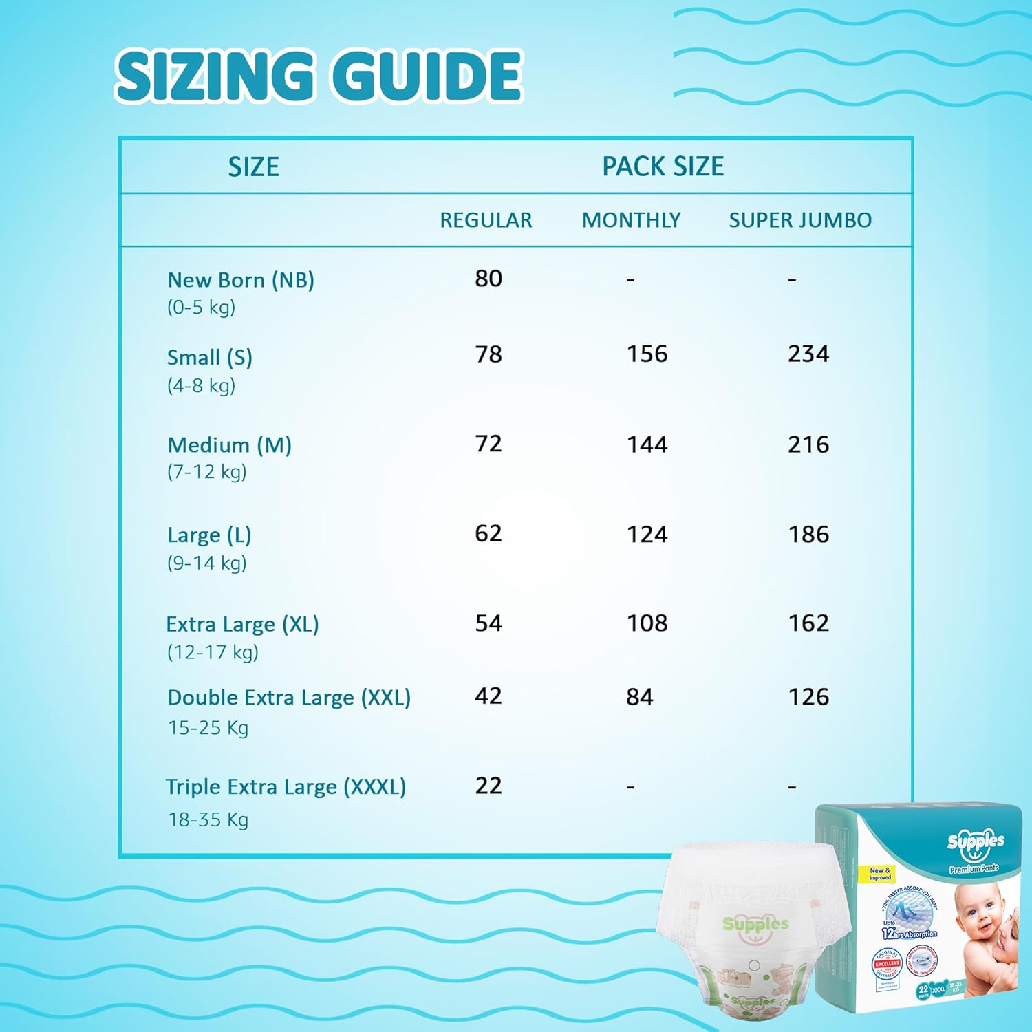 Comes in Various Sizes: Supples Diapers are available in sizes NB, S, M, L, XL, XXL and XXXL