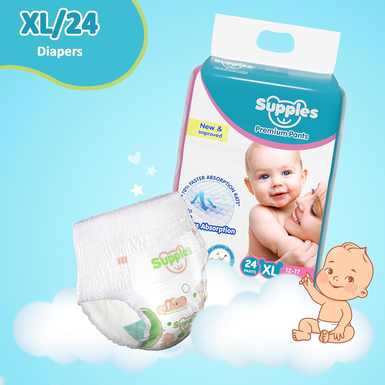 Introducing Amazon Brand – Supples Premium Diapers in Extra Large (XL) size for babies weighing 12-17 kg, designed for utmost comfort day and night. Made of cushiony cotton soft fabric and non-woven, breathable materials, these diapers provide gentle care for delicate skin. The Zig-Zag Channel top layer and ADL technology allow efficient liquid distribution, keeping the diaper dry and comfortable. Featuring a Gel Magnet Bottom layer, these diapers offer up to 12 hours of superior absorption. The triple leak guard system with side cuffs prevents any leakage, while the large absorbing capacity provides maximum dryness. Supples Diapers are free from phthalates, making them gentle on your baby’s skin. These diapers are BIS-compliant for safety and have been dermatologically tested by dermatest Germany. These diapers come with a convenient elastic waistband that is easy to wear and remove, providing a snug fit for your little one’s delicate skin. Available in various sizes including NB, S, M, L, XL, XXL and XXXL; Supples Diapers offer you multiple options to choose from. Say hello to comfortable diapers! Order now!