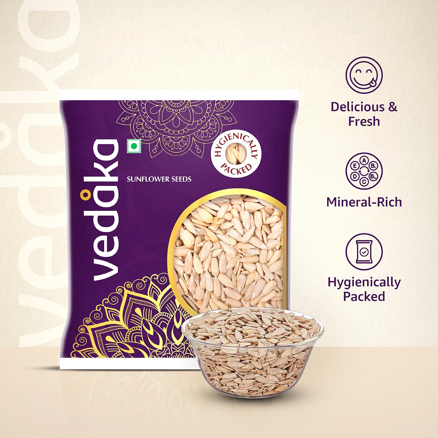 Introducing Vedaka Raw Sunflower Seeds. This product offers the fresh and natural taste of sunflower seeds for a satisfying snack. Packed in a hygienic polybag at a facility that meets food safety standards, these seeds ensure cleanliness and quality. Rich in magnesium and other minerals, they make for a great snacking option. Ideal for on-the-go snacking, baking, or adding a crunchy texture to meals, these versatile seeds come in a 500g pack.