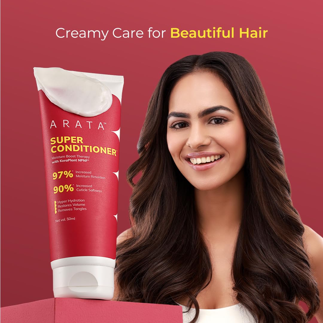 𝗣𝗥𝗘𝗩𝗘𝗡𝗧𝗦 𝗛𝗔𝗜𝗥 𝗗𝗔𝗠𝗔𝗚𝗘: The Arata Super Conditioner is infused with science-backed actives and superfoods that penetrate deep into the cuticle to fill in damaged spots, making your hair strong and resilient. Regular use of the conditioner will ensure your hair stays resistant to external damage, breakage, and split ends.