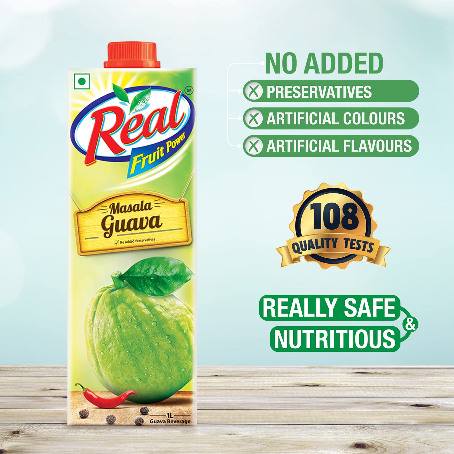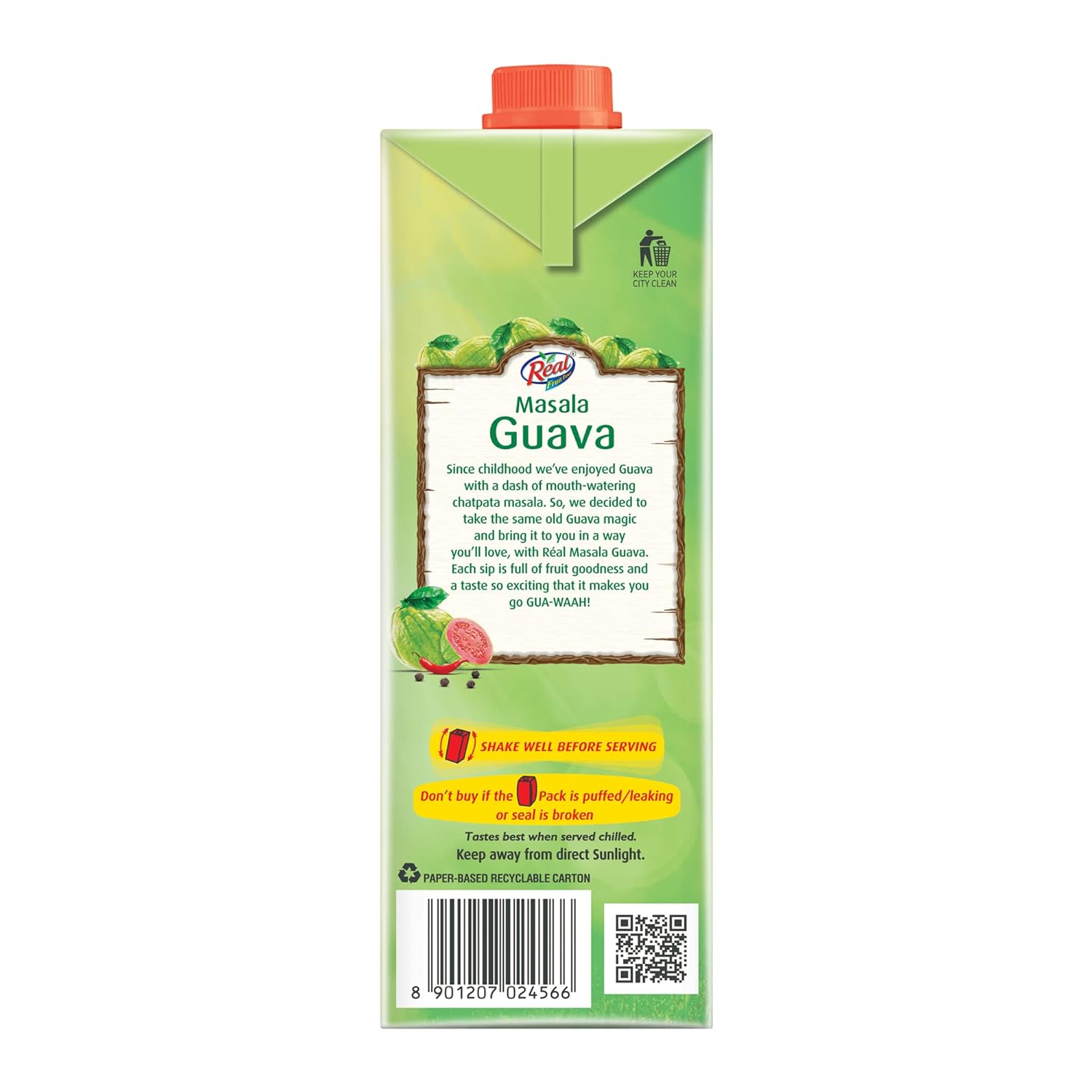 Since childhood, we have enjoyed guava with a dash of mouth-watering chatpata masala. So we decided to take the same old guava magic and bring it to you in a way you will love, with Real Masala Guava. Each sip is full of fruit goodness and a taste so exciting that it will make you go GUA- WAAH! Made from the best quality fruits, Réal Fruit juice has no added preservatives; hence it offers not just taste, but also Fruit Power – the power to stay ahead. Réal’s ingredients are endorsed by PFNDAI (Protein Foods & Nutrition Development Association of India) to produce only the finest quality of fruit juice in India. This comes to you in an aseptic 6-layered Tetra Pak which ensures that the juice has all of the all the goodness and nutrition of the fruit when it reaches you.