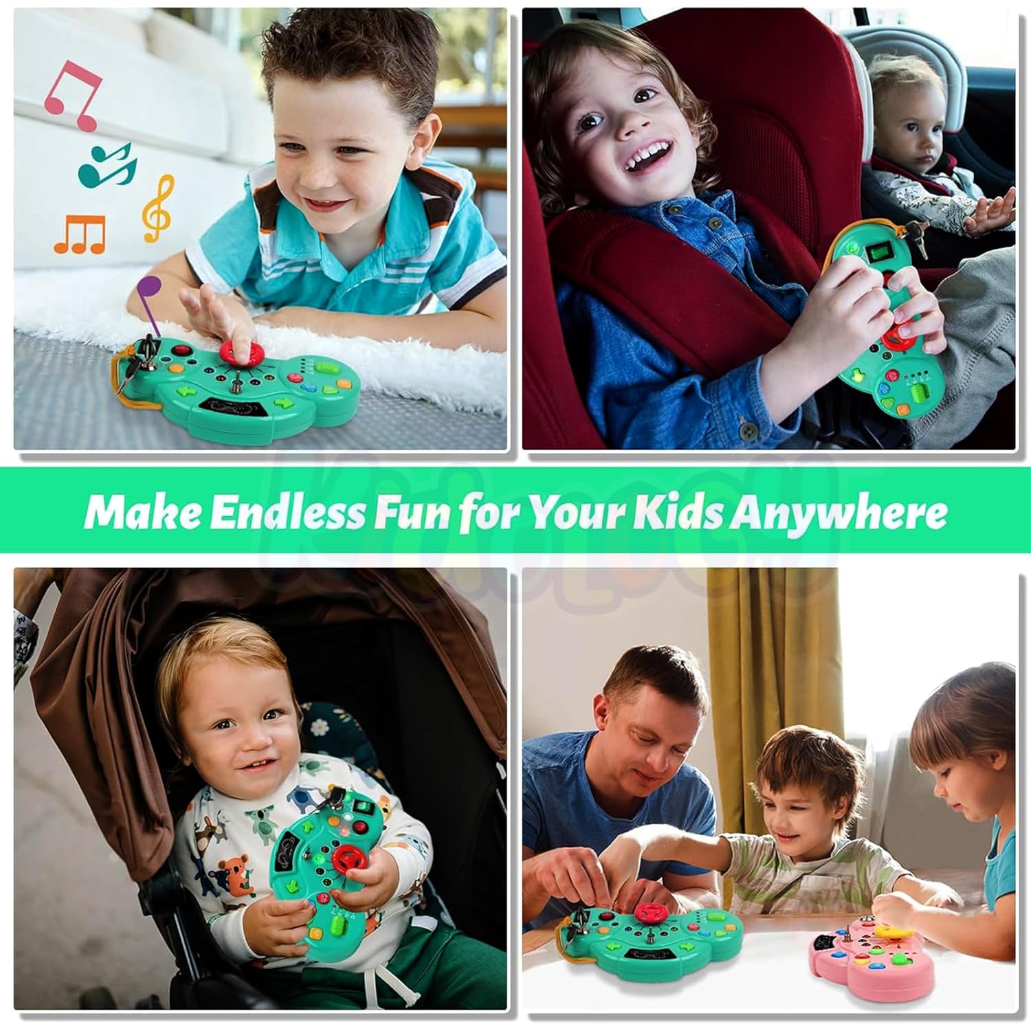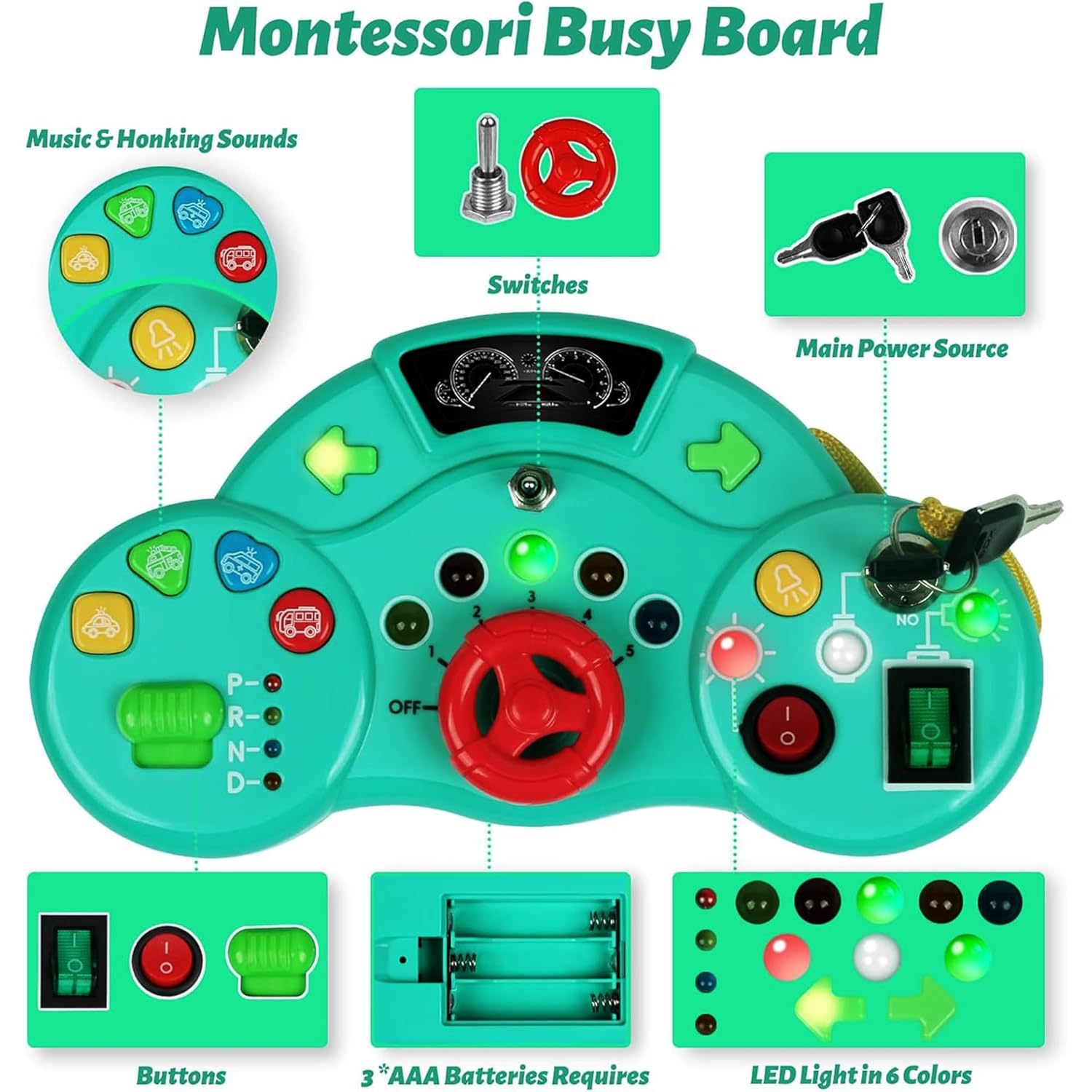 Kidology Montessori LED Busy Board – Sensory & Musical Learning Toy for Toddlers, Car Horn & Siren Sounds, Key & Switch Activities for Fine Motor & Cognitive Development – Portable Travel Toy – Green
