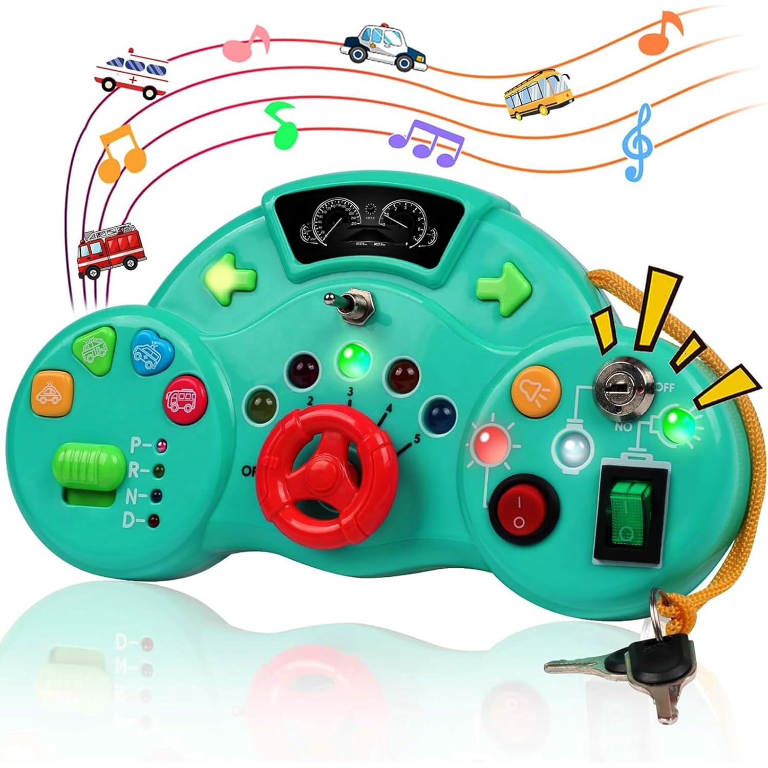 🚗 Car Dashboard Theme – Steering wheel, key, toggle switch and levers imitate driving – perfect for imaginative play and pretend driving mode.