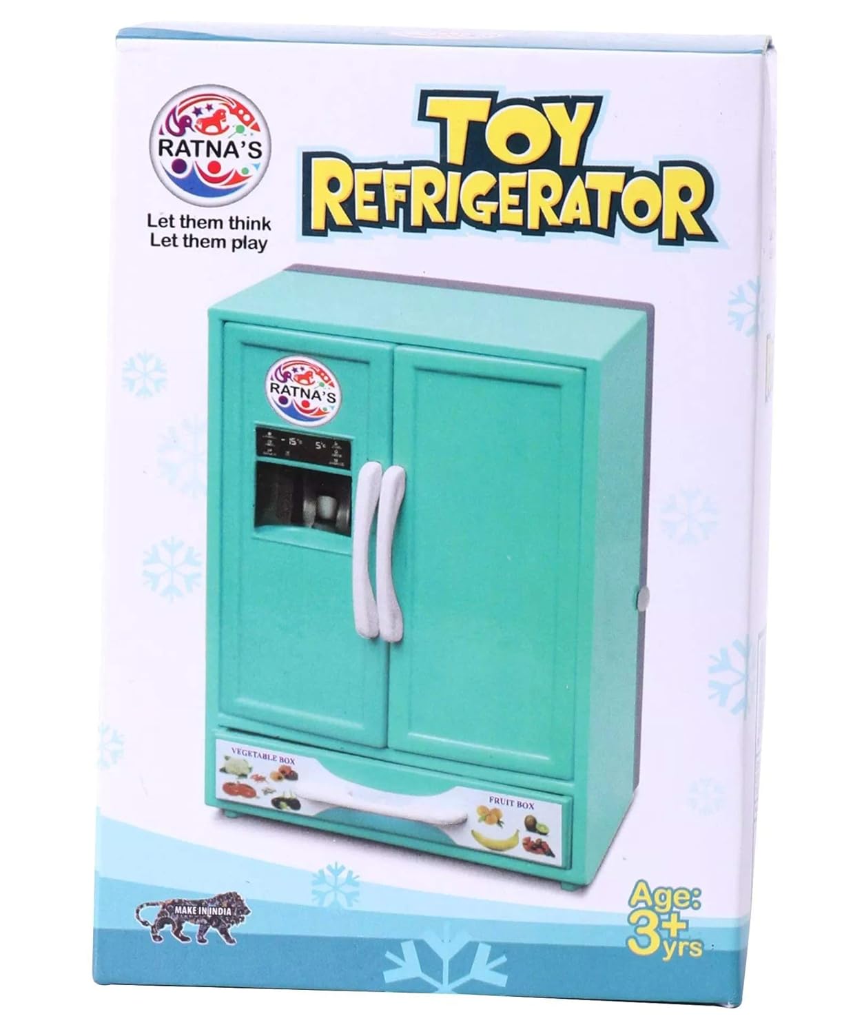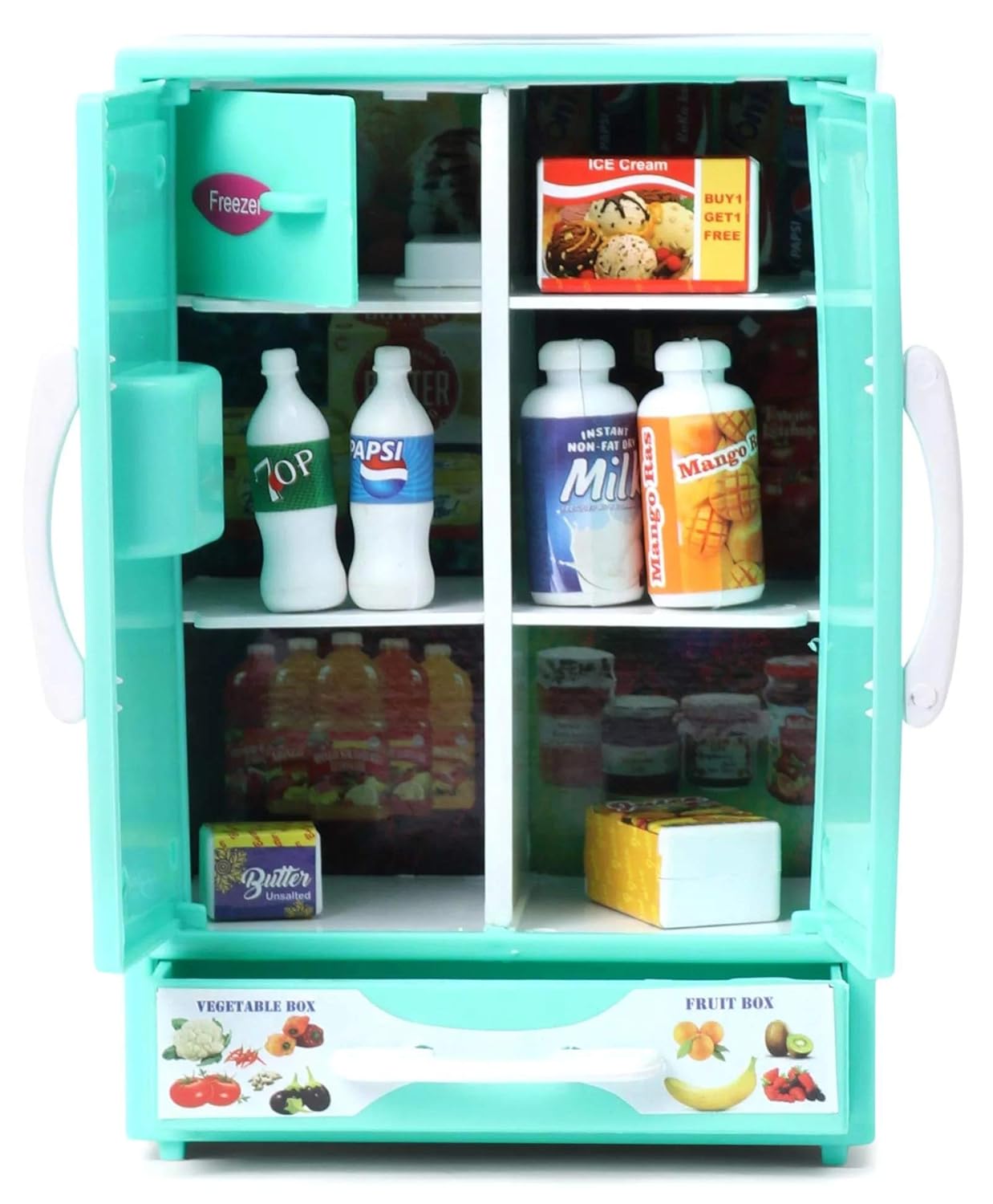 1 Refrigerator, 2 Toy Ice Trays, 1 Buttor Box,2 Toy Cold Drink Bottle, 1 Toy Tetra Pack, 2 Toy Fruit Juice Pack, And 1 Toy Ice Cream Pack