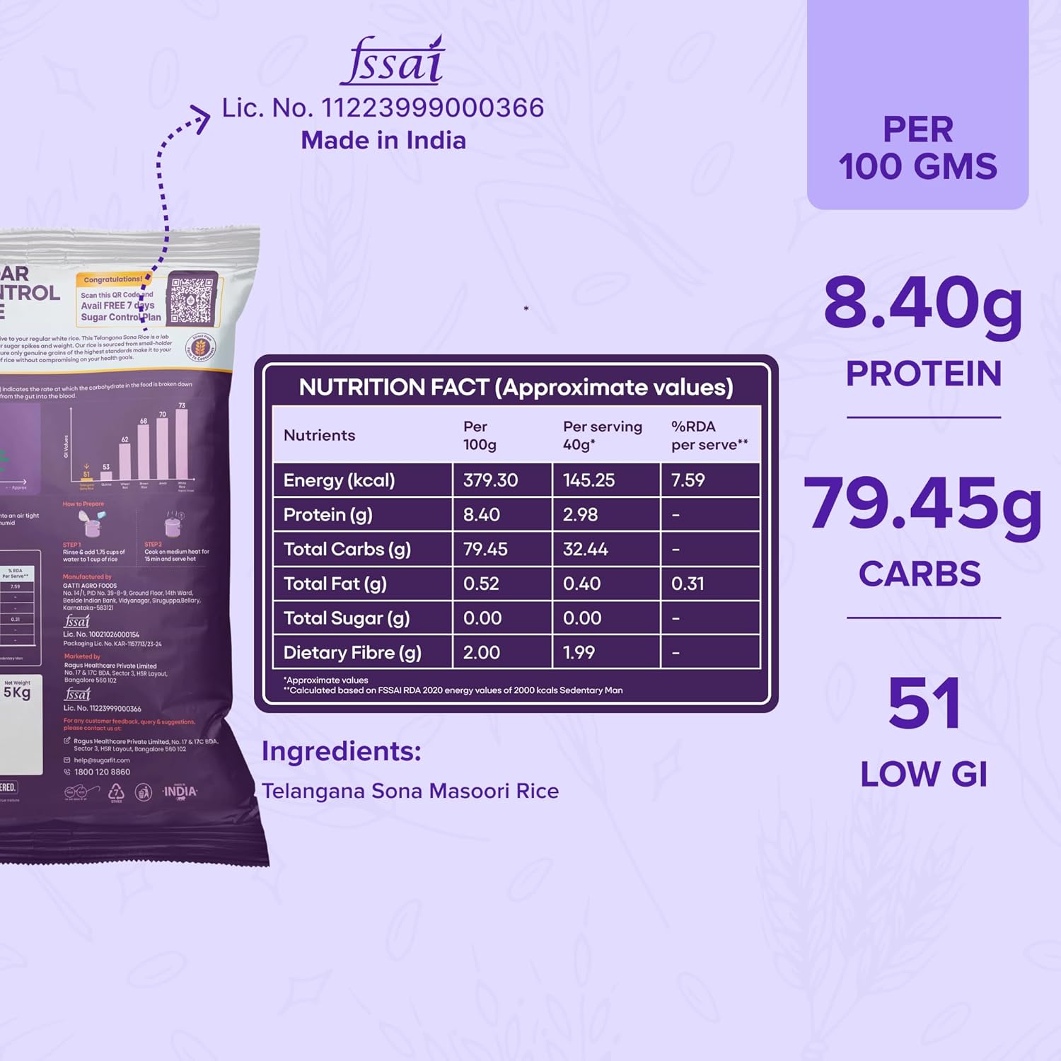 Sugar.fit Sugar Control Rice 5kg, Sona Masoori Rice, Lab Tested Low GI for Diabetic, Full Grain Raw Rice, 100% Natural, Supports Healthy Blood Sugar Levels