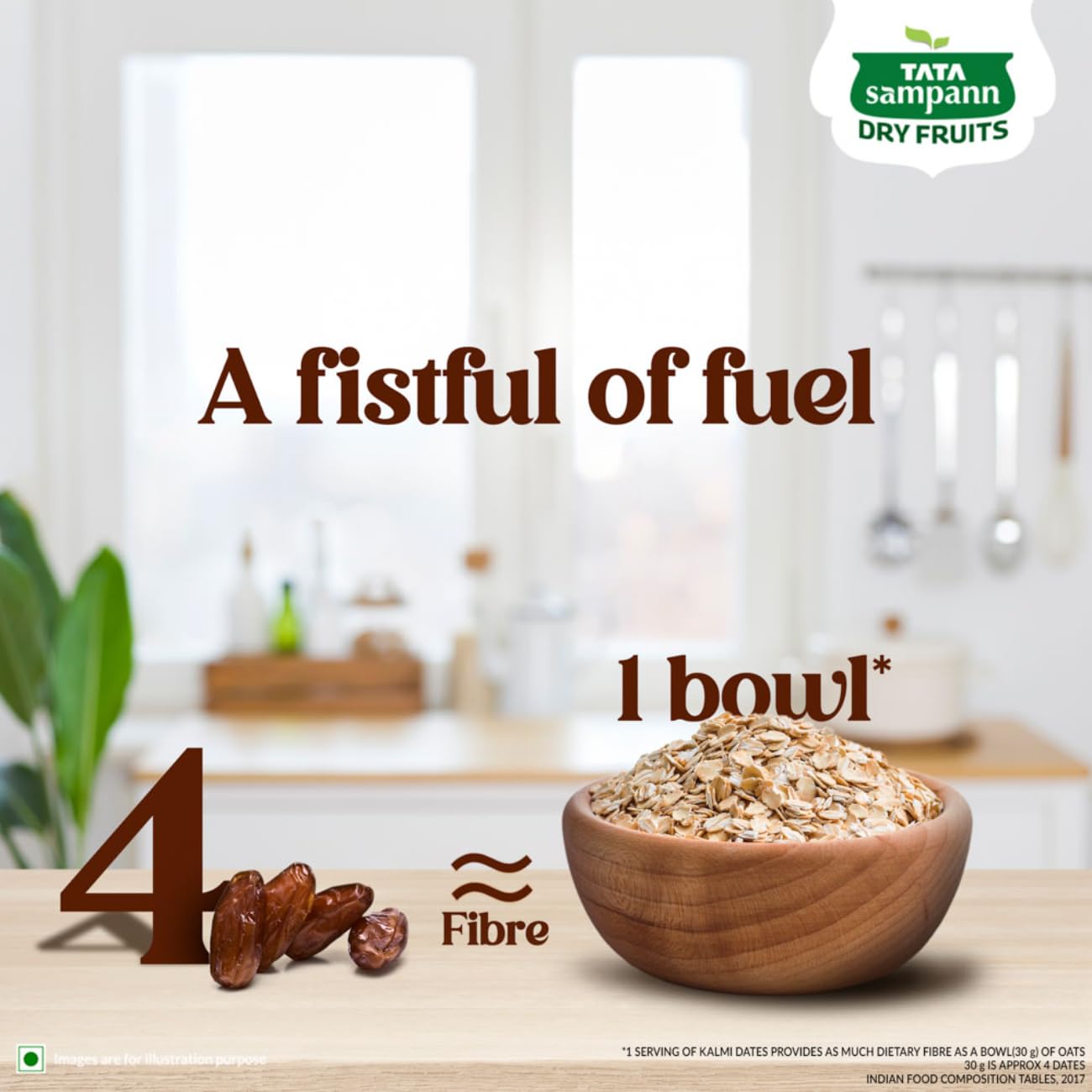 Experience the magic of Tata Sampann 100% Premium Kalmi Dates, where tradition meets taste. Rich in fibre with naturally sweet and low-fat food qualities , these dates are more than just a delightful snack—they are a testament to quality and care. 1 serving of Kalmi Dates(4 dates) provides as much dietary fibre as a bowl (30 g) of oats.