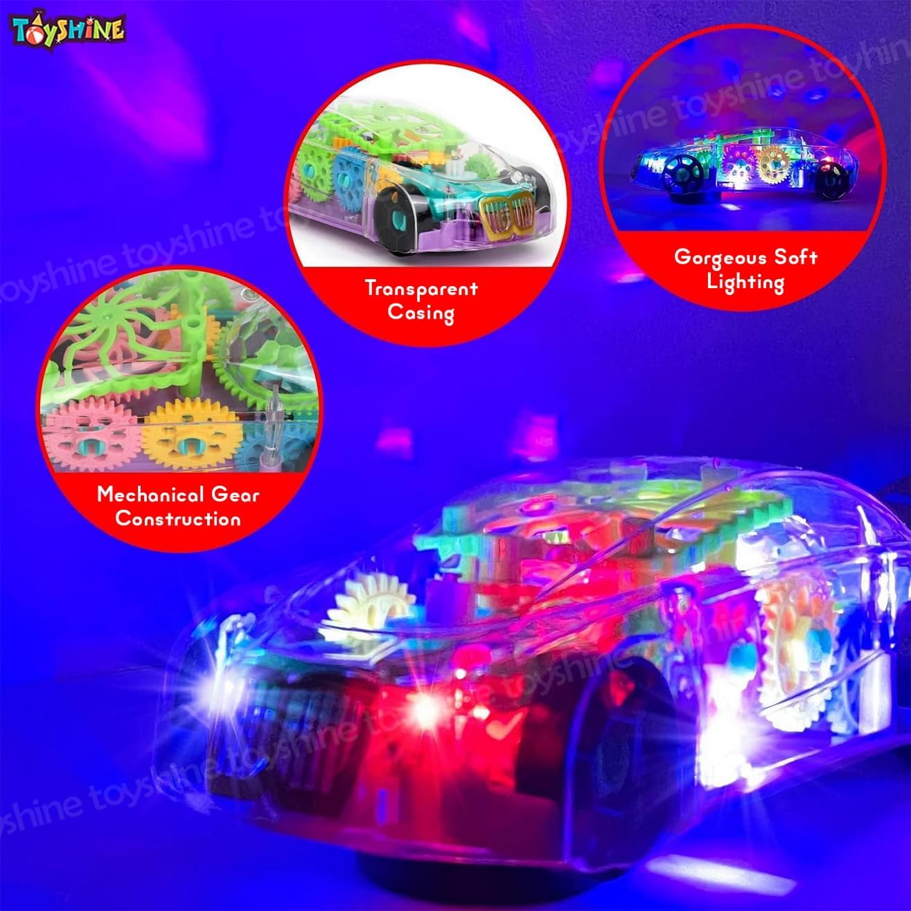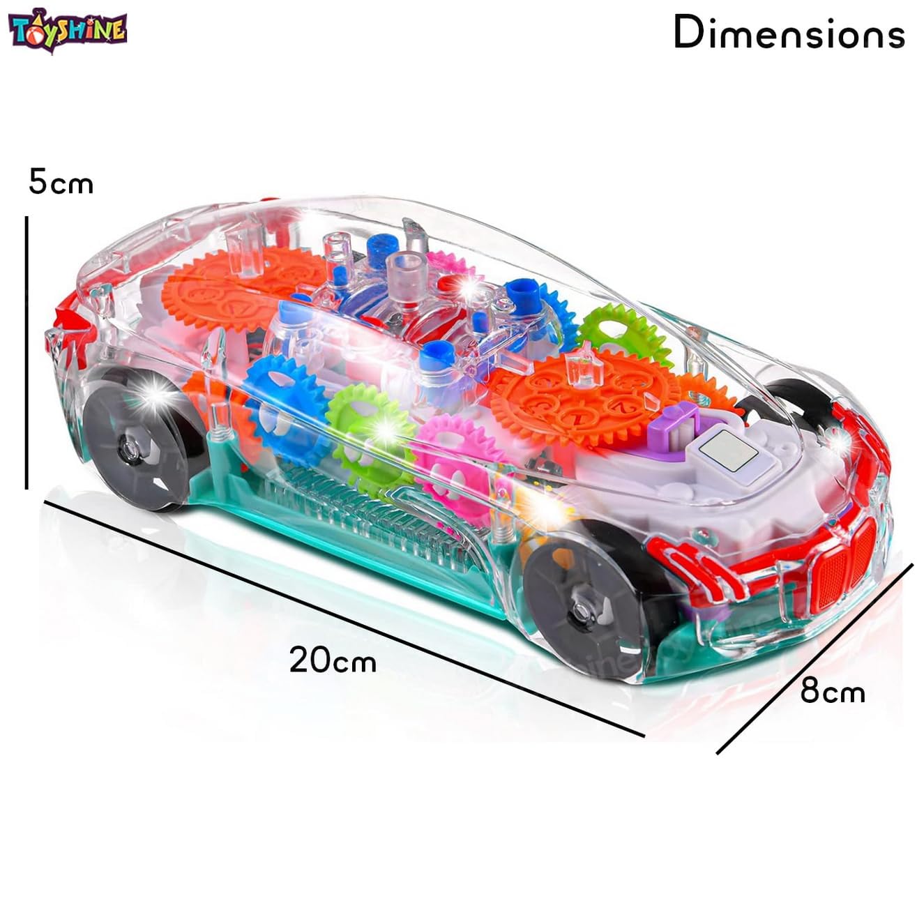 bp 1- Toys and Games; Transparent Concept Racing Car with 3D Flashing Lights car with functions: Forward/ Backward, Stop. Unique Design – Transparent design, one Can see the gear inside, helps the kids to know mechanical concept.