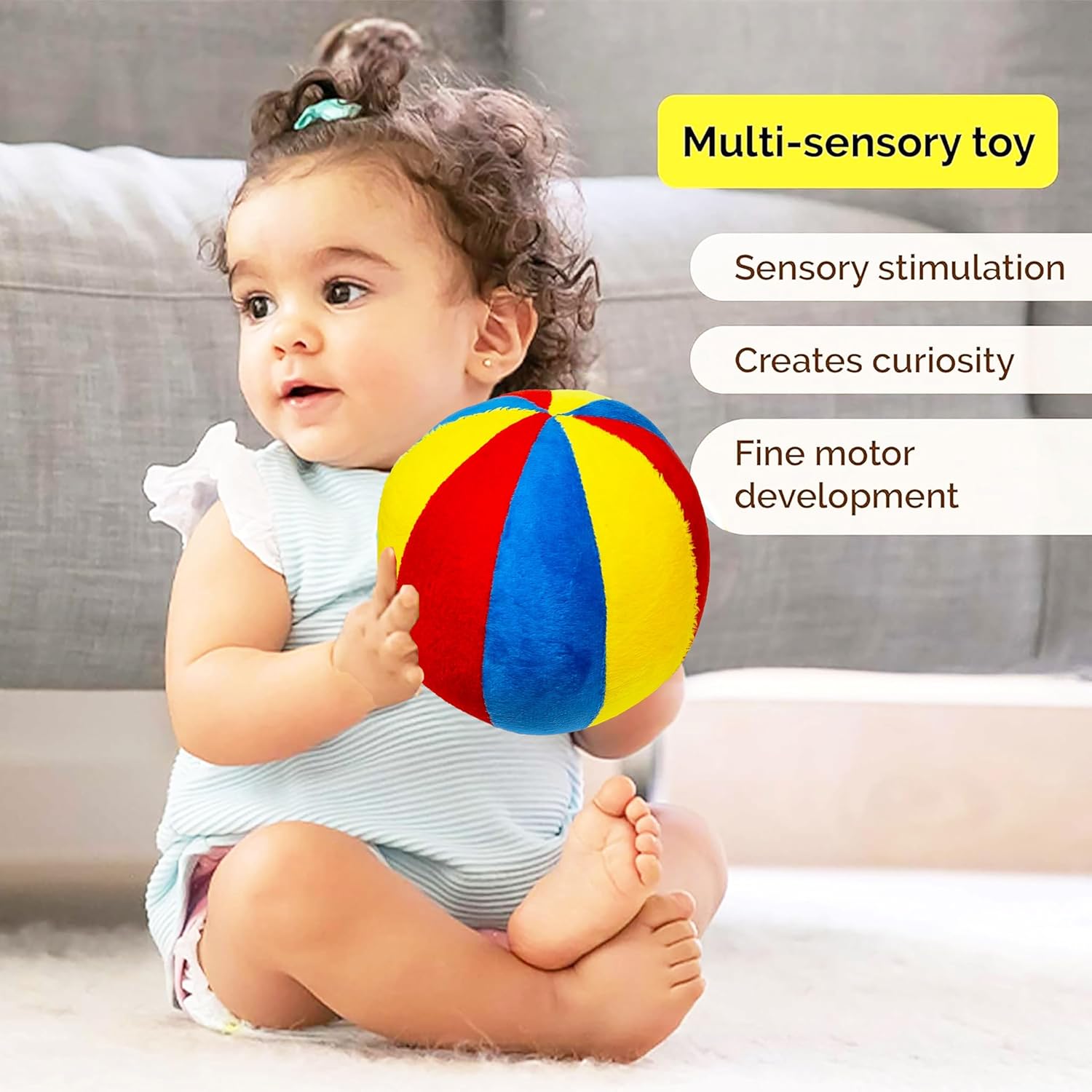 ENCOURAGES MOTOR SKILL DEVELOPMENT – Perfectly sized for tiny hands, this plush ball promotes grasping, throwing, rolling, and coordination skills. It helps strengthen fine and gross motor development while encouraging movement. Babies can practice hand-eye coordination, improve muscle control, and engage in fun, active play that supports their early physical development.